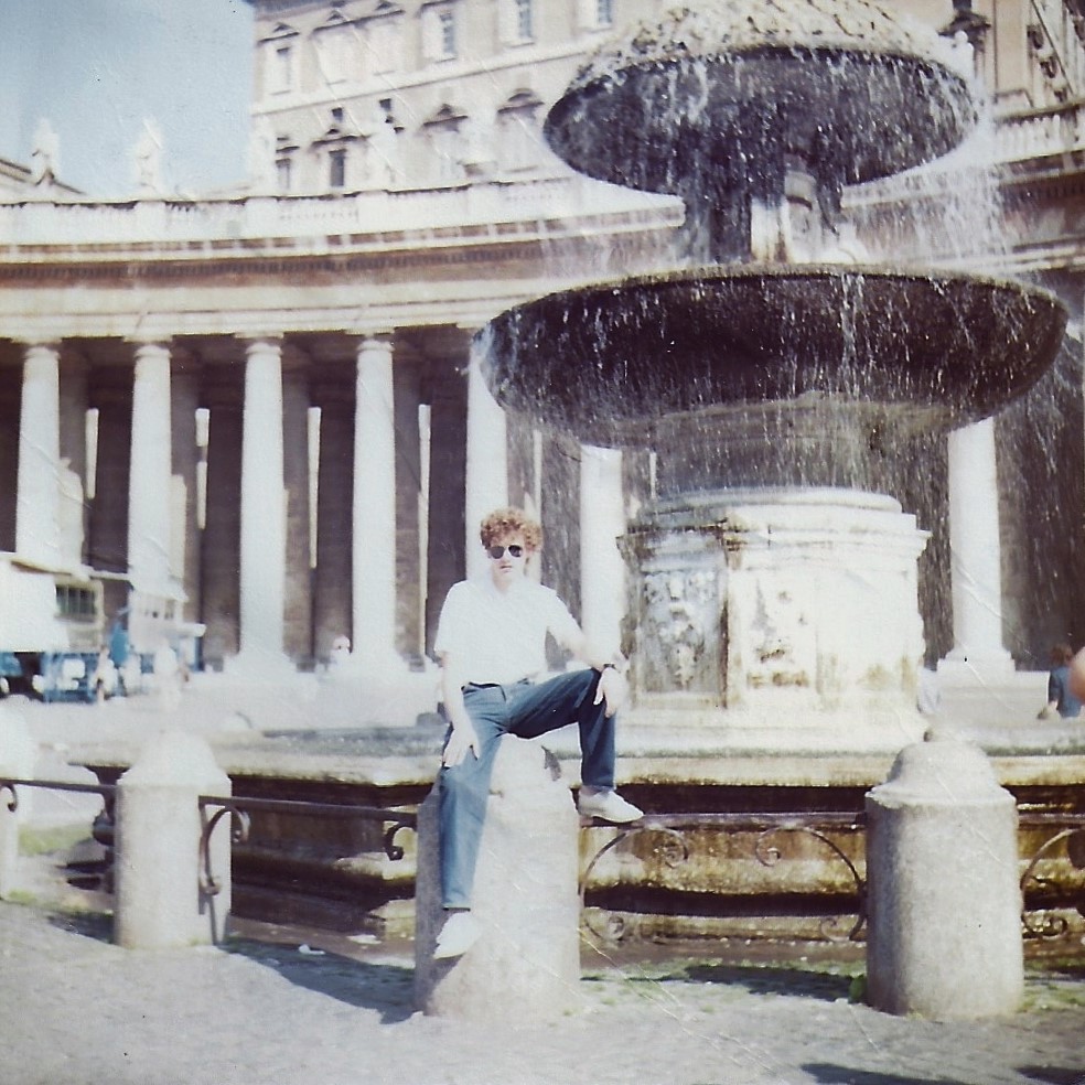 Op het Sint-Pietersplein staan aan weerszijden van de obelisk twee 14 meter hoge fonteinen met grote, monolithische waterbekkens van oosters graniet. De rechter is door Maderno in 1613 gemaakt, de linker - die we hier zien - door Carlo Fontana in 1677. Achter de colonnade zien we een deel van het pauselijk paleis, waar wij naar de zwakke stem van paus Johannes Paulus II mochten luisteren. © foto (de camera van) Roger Schenk |