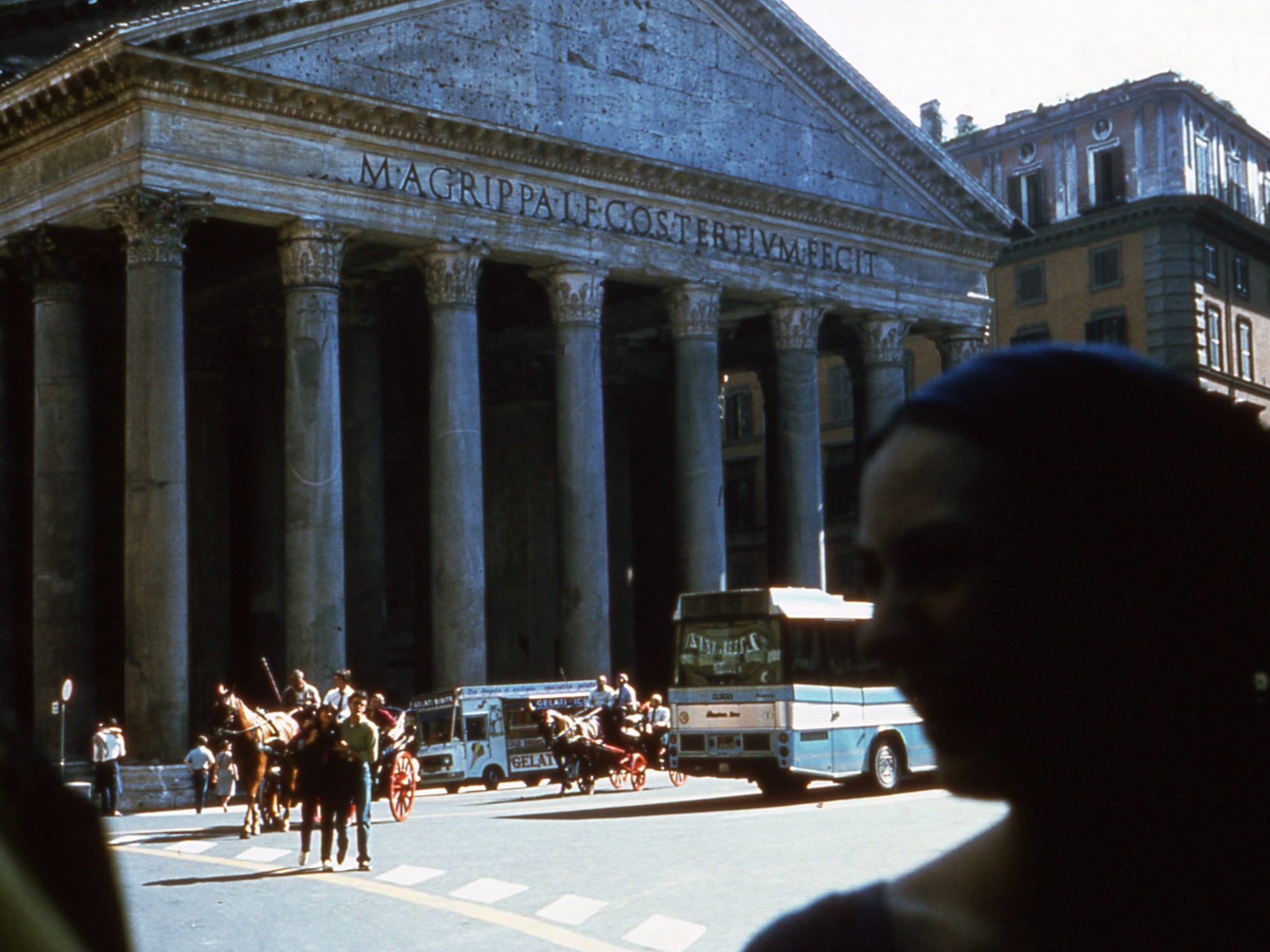 Het Pantheon werd gebouwd door Marcus Vipsanius Agrippa in de eerste eeuw v.C. Aan het begin van de tweede eeuw n.C. werd het oude gebouw geheel nieuw opgetrokken onder keizer Hadrianus (117-138); uit respect is op de voorzijde de oude inscriptie M. Agrippa L. f. cos. tertium fecit (voluit: Marcus Agrippa Lucii filius consul tertium fecit, in vertaling: Marcus Agrippa, de zoon van Lucius, voor de derde maal consul, heeft dit gemaakt.). Agrippa was voor de derde keer consul in 27 v.C. en zo kunnen wij het oude gebouw exact dateren. © foto Brigitta Maassen |