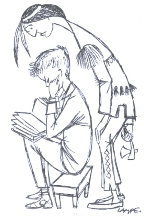 Oef, gij Bleekgezicht, gromt hij tegen zn zus, als ze haar rekenschrift niet vinden kan. Oef, vier goede ogen zien meer dan honderd slechte.