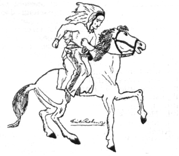Frits Rieken beproefde zijn tekentalent op een Indiaan op een steigerend paard. Indianen blijven de jeugd altijd boeien. Wisten jullie dat Indianen eigenlijk de oorspronkelijke bewoners van Amerika zijn? Ze hebben een roodachtige bruine huidskleur en zwart haar. Hun huidige omstandigheden zijn in de verschillende delen van Amerika zeer ongelijk. In Zuid-Amerika nemen ze een belangrijke plaats in. De meeste jongens vinden Indianen verhalen prachtig! Ze lezen ze in één stuk achterelkaar uit en hebben bij dit lezen rode oortjes van spanning. Karl May heeft veel Indianenverhalen geschreven. Wie kent Winnetou niet? Een prachtige tekening, Frits! Ik was er heel blij mee.