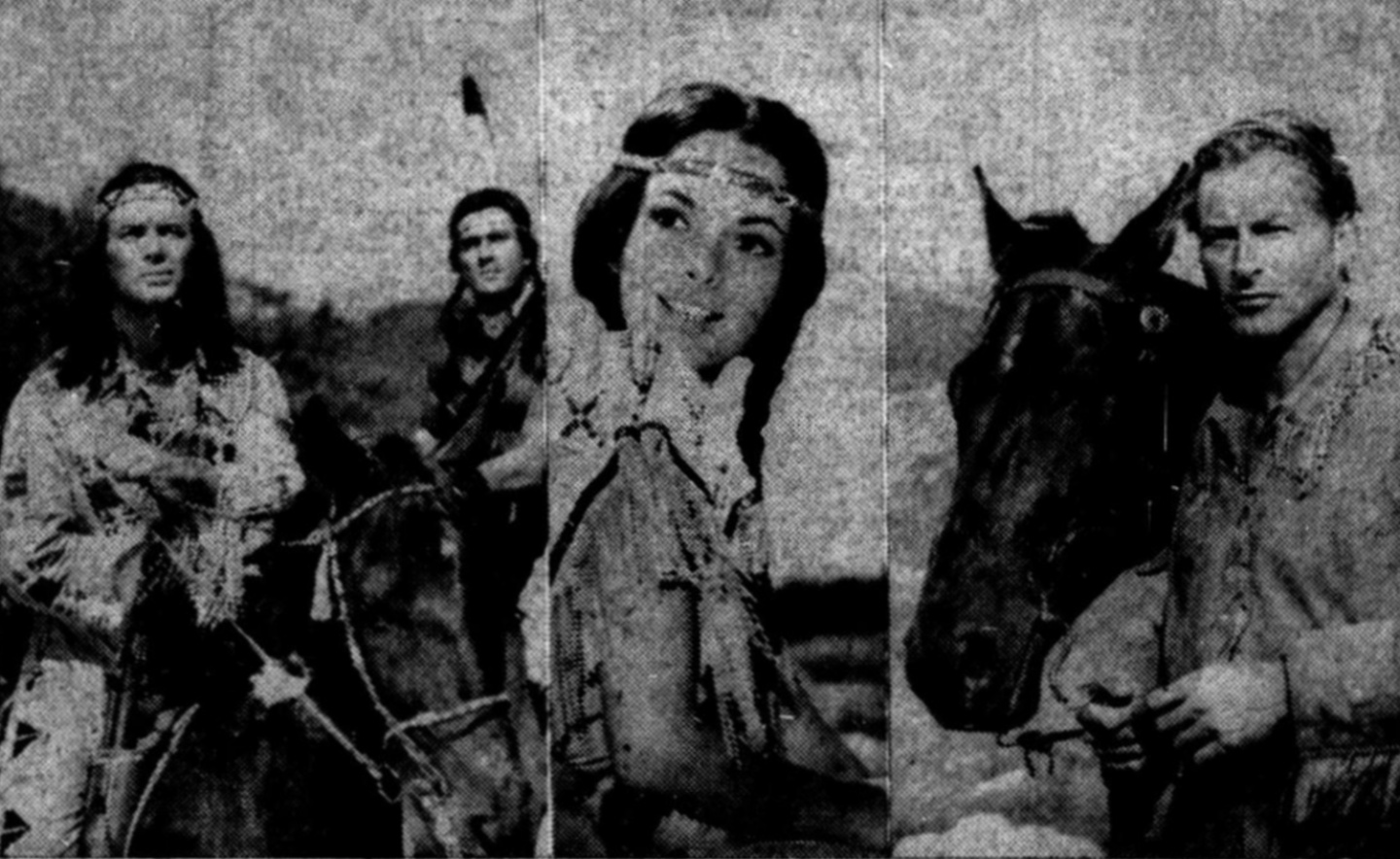 Vrienden van jong en oud: PIERRE BRICE als Winnetou, KARIN DOR als Ribanna en LEX BARKER als Old Shatterhand (v.l.n.r.)