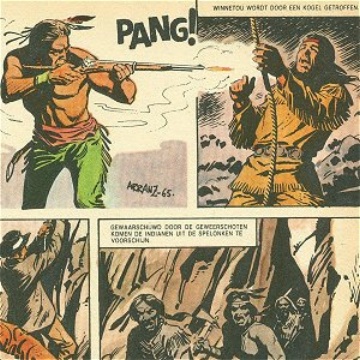De Arranz-tekeningen daarentegen, die voorafgaan aan de prent waarop Winnetou dodelijk wordt getroffen, laten aan duidelijkheid niets te wensen over. Achter de foute indiaan op wacht tekent zich een natuurlijk landschap af dat indruk maakt. De steile wand oogt als een onneembare muur en de geknevelde dorpelingen figureren als nietige schepsels. |