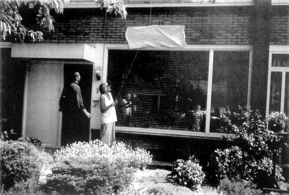 Mevrouw Van den Hout en ik gniffelden bij het zien van alle nieuwsgierige blikken die gericht waren op hetgeen zich aan de muur boven het huiskamerraam bevond: een stuk doek waaraan een touw was bevestigd dat naar beneden hing.