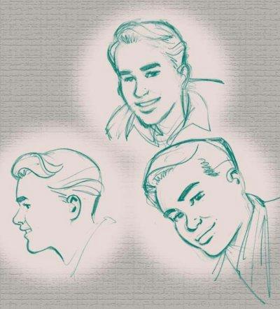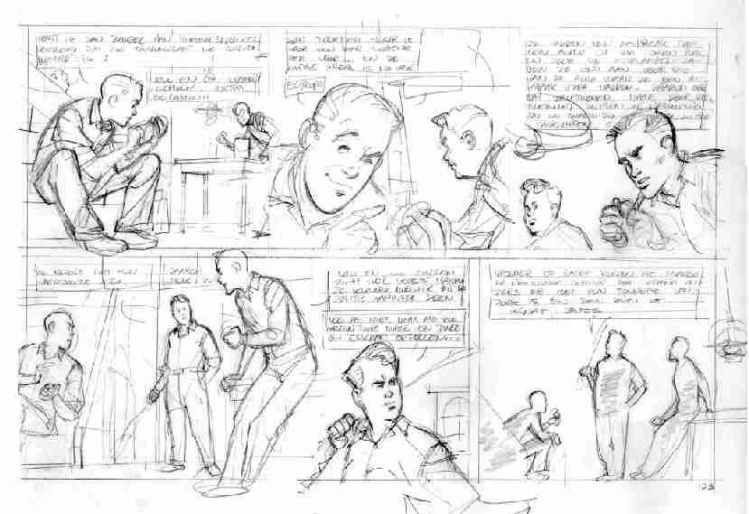 Ik ben begonnen met Van Oudenaarden uitvoerige beschrijvingen te sturen van Arie, Jan en Bob. Na heel wat heen-en-weer gemail zagen de jongens er echt uit zoals we ons voorgesteld hadden. En dat stripmaken, tja .. ik zei daarnet al: de boeken van Willem zijn eigenlijk al kant-en-klare scenarios. We voeren dus alleen maar uit wat hij ons zegt, en houden ons zo precies mogelijk aan het boek. Ik bewerk de oorspronkelijke tekst tot verschillende scènes, zoek uit wat de belangrijkste momenten en mooie cliffhangertjes zijn. Dan maak ik een pagina-indeling, verzin de plaatjes, of ze groot of klein zijn, de camera-instellingen, wat de voorkomende figuren doen en zeggen, een beetje achtergrond .. op basis daarvan slaat Van Oudenaarden aan het schetsen. En die schetsen bespreken we dan tot we het over de definitieve versie eens zijn. En dat gaat, met vallen en opstaan, inmiddels heel behoorlijk. |