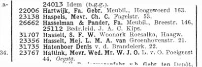 Sjoerd van Hasselt | Een van de leukere stukken is de verwarring die ontstaat als Jan, Bob en Arie op een groentewagen meeliften uit Zeeland en vervolgens alledrie een andere kant op gaan. Jan gaat achter de huurder van het zomerhuisje aan, Arie achter de Waterjuffer en Bob probeert detective Pijnenborg terug te vinden in Den Haag. Ze spreken af berichten uit te wisselen via een vriend van Jan die in Leiden op een woonboot woont, Sjoerd van Hasselt. Dankzij de inzet van de P.T.T. en de melkboer loopt dit helemaal in het honderd, en ach, als je niet meer weet hoe het afloopt kan ik alleen maar aanraden de hele trilogie nog eens te lezen! | Uit het telefoonboek van 1953 |