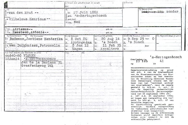 We komen te weten, dat de goede man - zoon van Adrianus van den Hout en Antonia Heesbeen - leefde van 27 juli 1882 tot 10 februari 1941, dat hij geboren en gestorven is in s-Hertogenbosch, dat hij op het moment waarop deze kaart werd gemaakt, zonder beroep was (gepensioneerd) en dat hij twee maal getrouwd is geweest: met Jantiena Henderika Bodéwes (op de kaart zonder accent aigu op de eerste e), geboren op 8 oktober 1886 te Appingedam (hun huwelijk werd net na het uitbreken van de Eerste Wereldoorlog gesloten te s-Hertogenbosch, om precies te zijn op 20 augustus 1914, en werd op 9 september 1929 ontbonden door overlijden - zoals dat in ambtenarentaal heet - van Jantiena Bodéwes) en vervolgens met Petronella (Nellie) van Duijghuizen, geboren op 8 januari 1912 te Megen (hun huwelijk werd 11 februari 1931 gesloten te Appeltern en duurde tot Willem seniors dood).