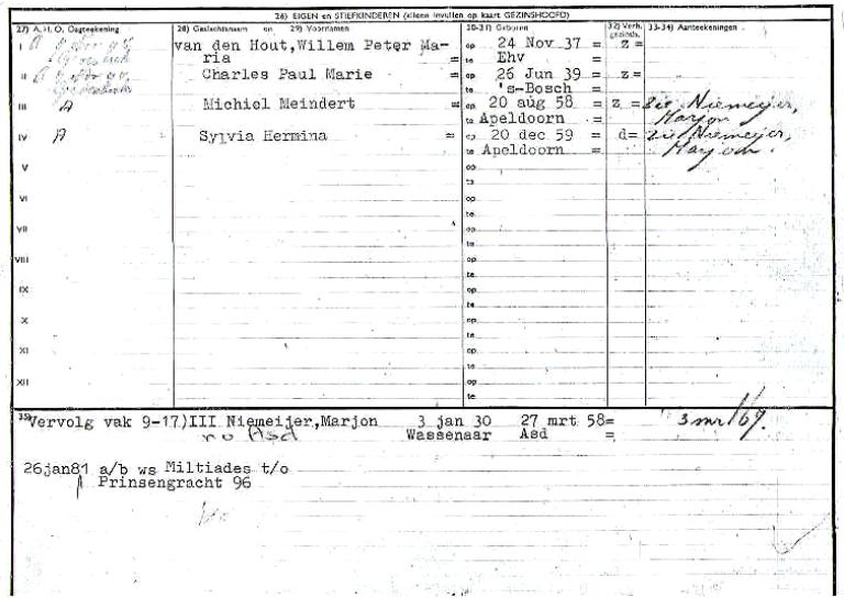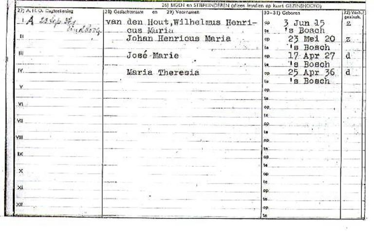 Op de achterkant van de persoonskaart van Willem sr. wacht ons een eerste verrassing: vader Van den Hout had niet alleen met zijn eerste vrouw Jantiena Bodéwes de drie ons bekende kinderen Willem jr., Joop (overleden op 10 juni 1975) en José Marie (die sinds haar verblijf in het land van Marianne Marie-José wordt genoemd), maar Petronella van Duijghuizen schonk hem nog een dochter: Maria Theresia, een halfzus van Willem, Joop en Marie-José dus.