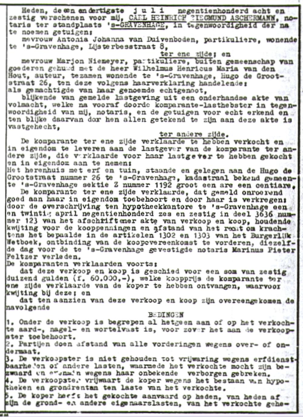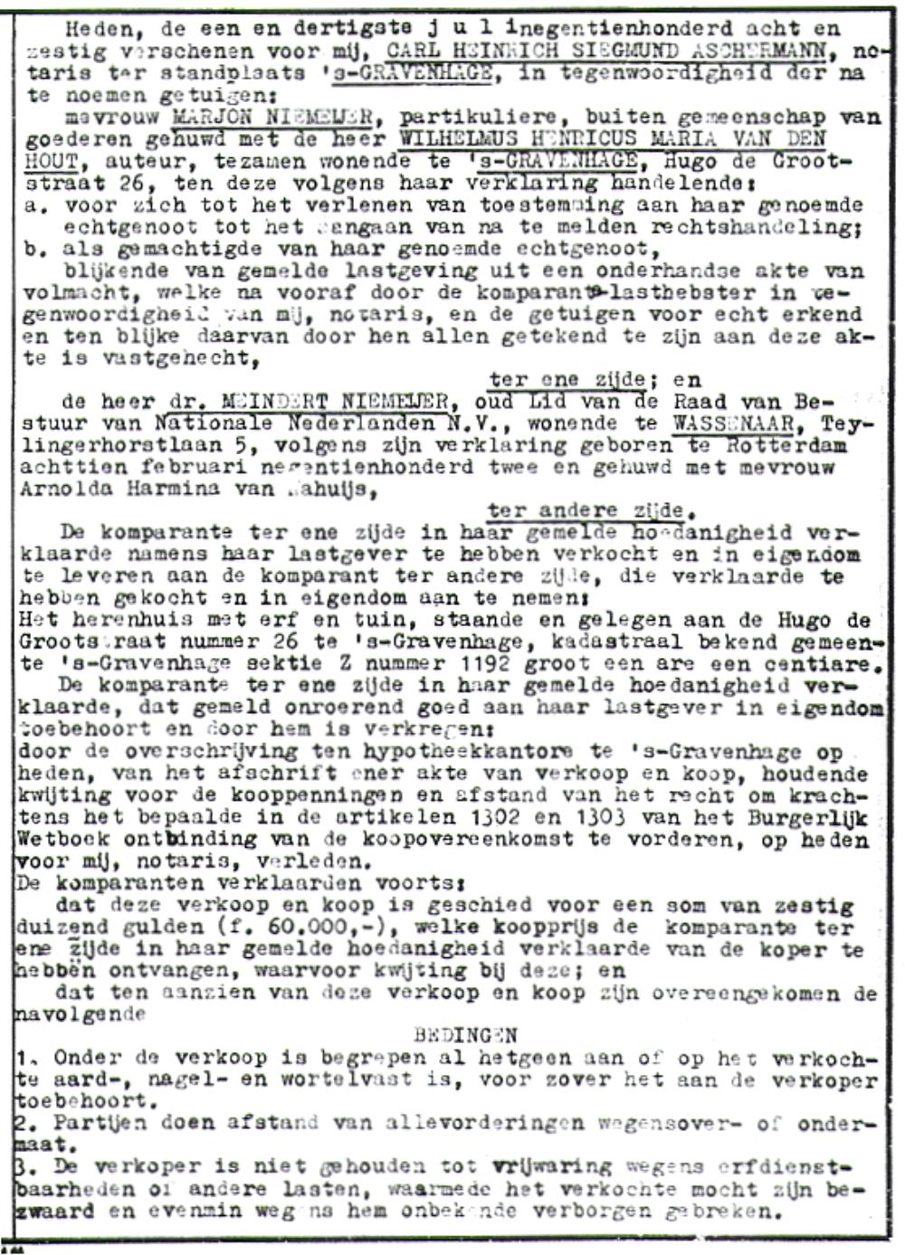 Sterker nog: uit bijgaande notariële bescheiden blijkt dat Willem hooguit één dagdeel - misschien zelfs maar een paar minuten - formeel eigenaar van genoemd pand is geweest! Op 31 juli 1968 kocht Marjon Van den Hout-Niemeijer het pand Hugo de Grootstraat 26, waar zij en Willem op dat moment al woonden, voor 60.000,- van Antonia Johanna van Duivenboden, in opdracht van haar niet bij de koop aanwezige echtgenoot. Op dezelfde dag en op hetzelfde notariskantoor (van Carl Heinrich Sigmund Aschermann) evenwel verkoopt Marjon het huis - eveneens in opdracht van haar man Willem, met wie zij buiten gemeenschap van goederen is getrouwd - aan haar eigen vader, dr. Meindert Niemeijer, oud-lid van de Raad van Bestuur van Nationale Nederlanden N.V., eveneens voor 60.000,-! |
