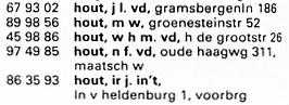 | * | Aangezien de bomen rondom het romantische buitenhuis met rietdak, rozentuinen vol luis en met twee oprijlanen in het idyllische Beekbergen al in september beginnen te druipen en in één ruk doordruipen tot en met april (Toen ik een nieuw leven ging beginnen, p. 266), vlucht het echtpaar Van den Hout net vóór aanvang van het nieuwe druipseizoen 1961 - op 15 augustus, om precies te zijn - terug naar Den Haag; en wéér wordt de Frederik Hendriklaan aldaar uitverkoren, ditmaal echter nummer 119. |