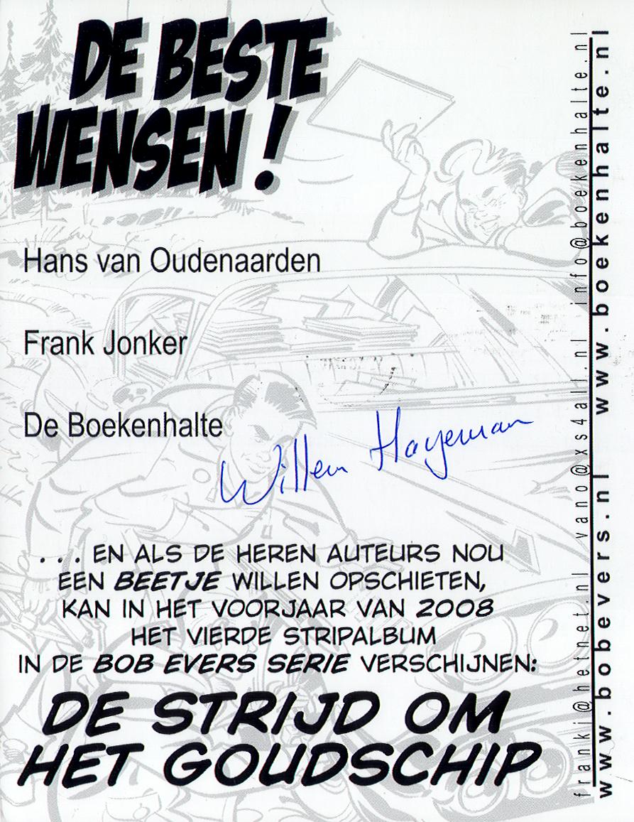 De redactie van de Bob Evers Nieuwsbrief ontving de volgende prachtige kerstkaart van Willem Hageman (De Boekenhalte), getekend door niemand minder dan Hans van Oudenaarden. Op de achterzijde van de kaart (rechts afgebeeld) wordt de stripversie van De strijd om het goudschip aangekondigd.