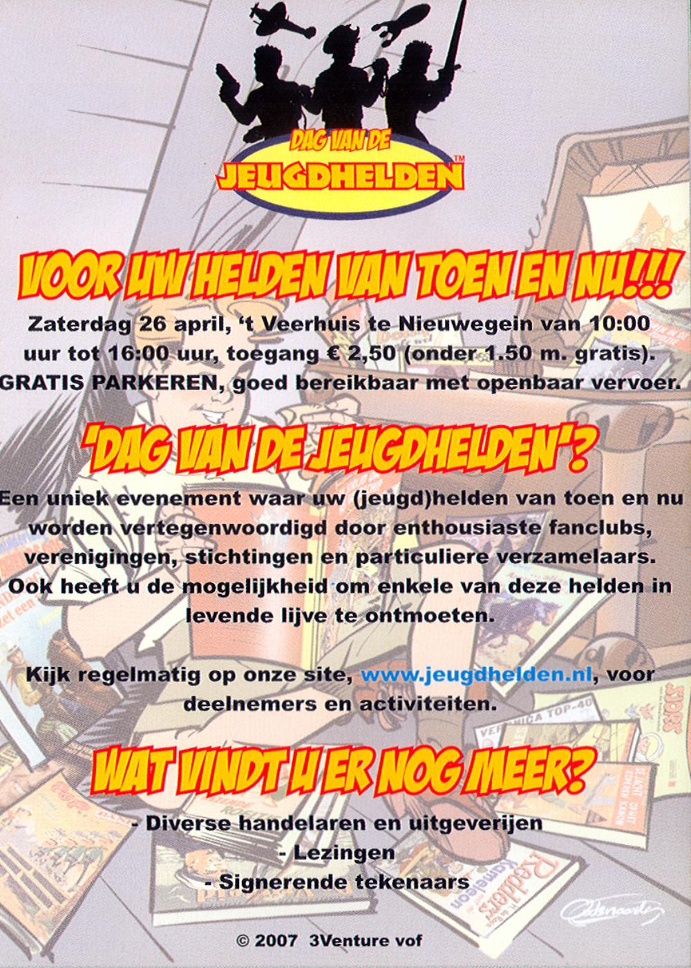 De flyer is vooral voor ons, Bob Evers-fans, interessant, want hij is getekend door Hans van Oudenaarden en beeldt Arie Roos uit, die een Bob Evers-strip zit te lezen! | |  |