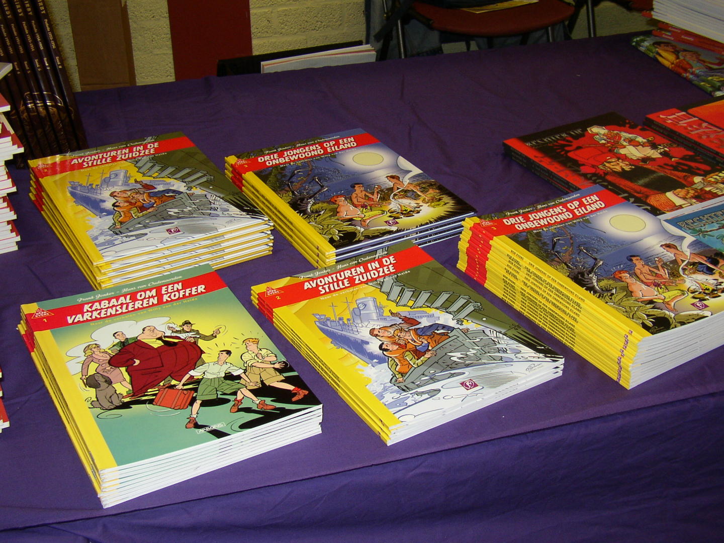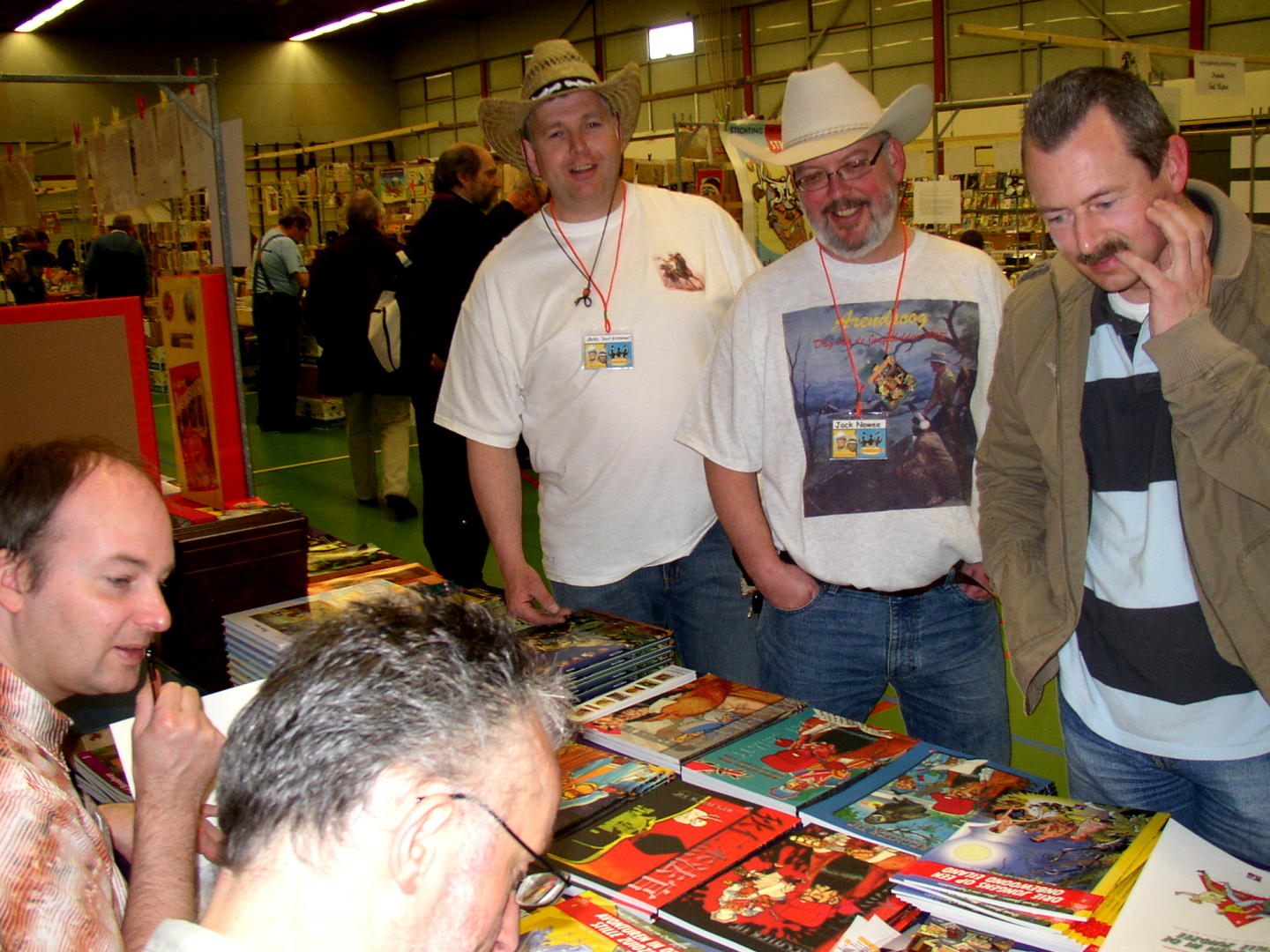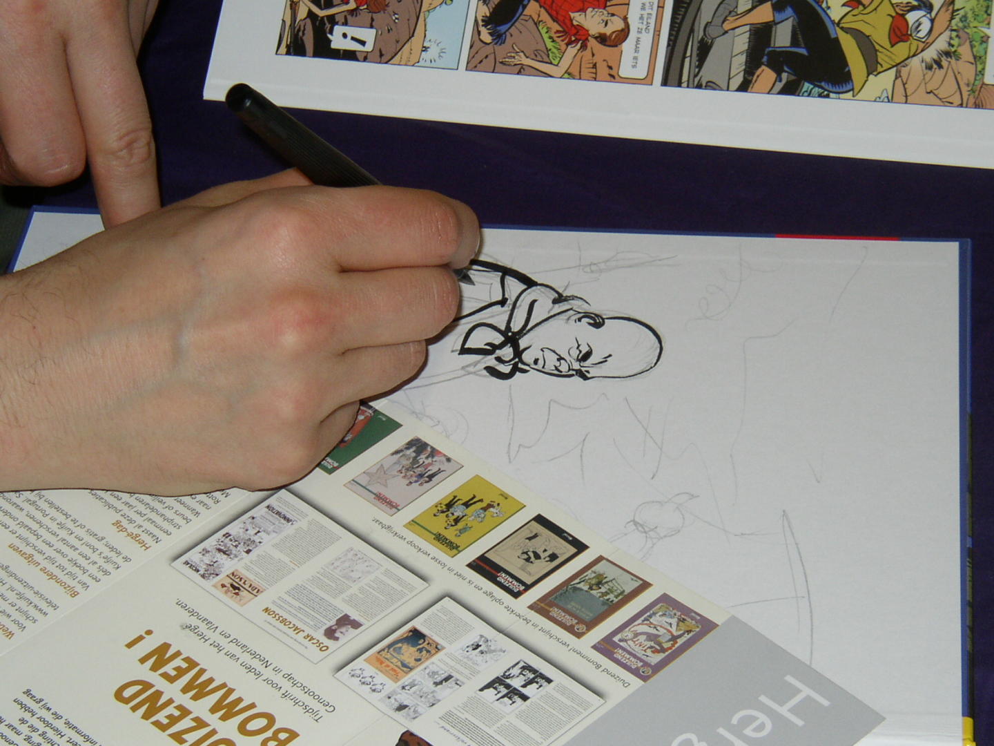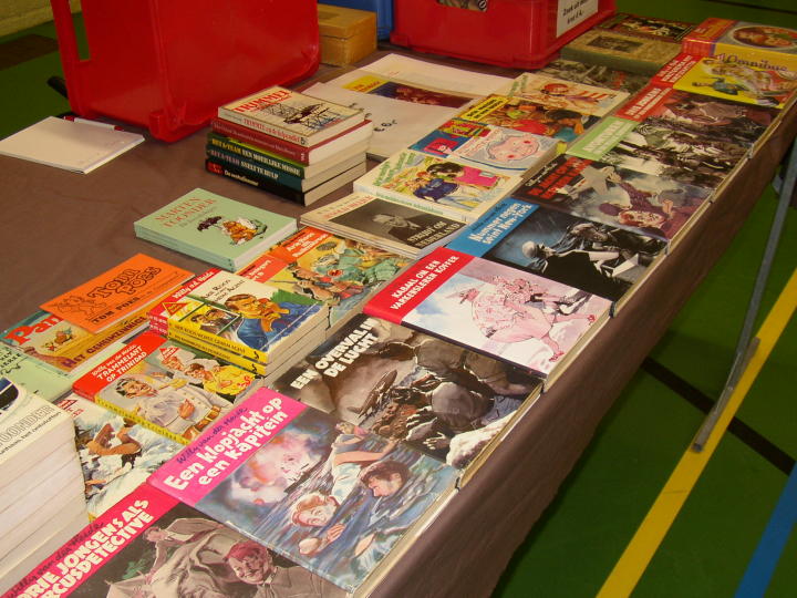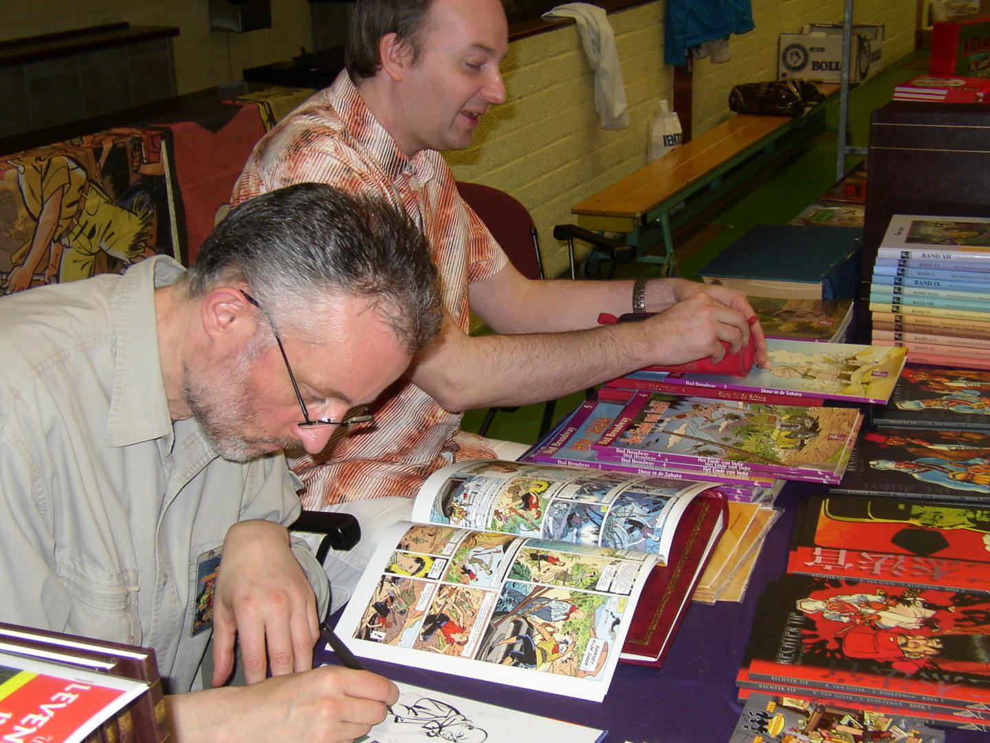 Volgens een bekende voetballer: Elk nadeel heb se voordeel: dat ging in dit geval ook op, want door de teleurstellende opkomst was er weer net als vorig jaar voldoende tijd voor de liefhebbers om hun strips van teksten en tekeningen te laten voorzien door het duo Frank Jonker en Hans van Oudenaarden, zoals onderstaande fotos laten zien.