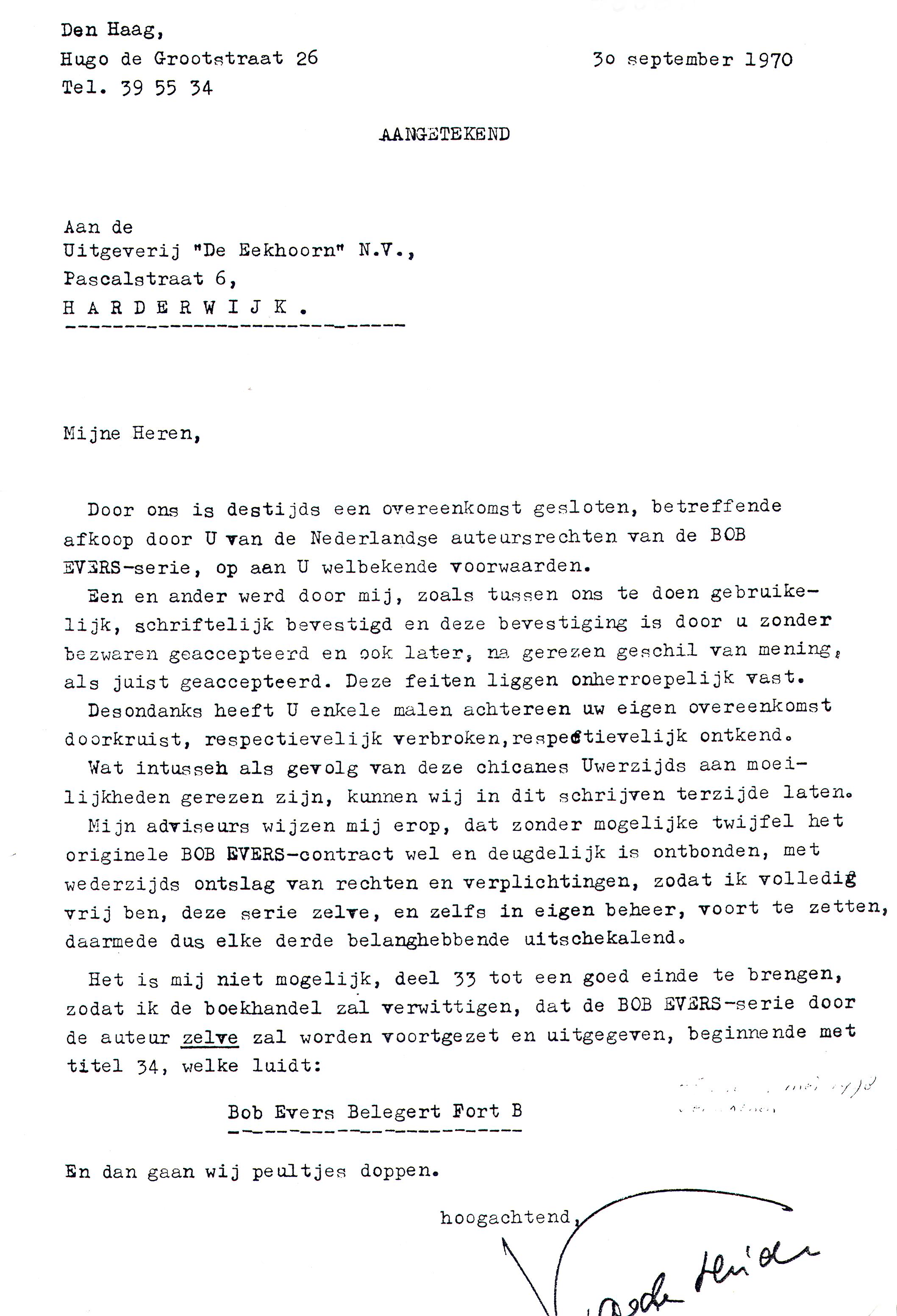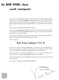 Dankzij Evert van der Spek - welbekend van zijn bijdragen in Nieuwsbrief 12 t/m 14 - kan het Genootschap beschikken over een brief en een circulaire van Willy van der Heide; met name de brief, die ook in de circulaire genoemd wordt, werpt een geheel nieuw licht op de datering van Bob Evers belegert Fort B: op zn minst moet het plan om de Bob Evers-serie voort te zetten, al in 1970 zijn ontstaan. Was deel 34 toen al klaar of bestond het alleen maar in concept? Voor Willem, die in dezen blijkbaar blindelings vertrouwde op de in zijn brief genoemde adviseurs lagen de zaken heel duidelijk: deel 33 viel volgens hem (hen?) nog onder het oude Eekhoorn-contract, maar het zou Willem - in zijn visie althans - vrij staan om vanaf deel 34 vrolijk verder te gaan met de Bob Evers-serie. Willem zou er alras achter komen dat de zaken toch niet zo eenvoudig lagen als hij dacht: hij zou rond 1973 een contract hebben getekend met Unieboek in Bussum om nieuwe Bob Evers-deeltjes te laten verschijnen; ten tijde van het inmiddels (in de polder) wereldberoemde interview met Pamela Koevoets is het typoscript van Bob Evers belegert Fort B in ieder geval reeds af. Uiteindelijk zouden de delen 34 en 35 pas in 1977 resp. 1978 verschijnen bij Van Holkema & Warendorf; deze uitgaven waren indertijd weliswaar gewoon in de winkel verkrijgbaar, maar tóch dusdanig illegaal dat zelfs geen Nederlandse drukker zijn vingers eraan wilde branden: de boekjes zijn in de toenmalige DDR gedrukt. Arie Roos als ruilmatroos moet in elk geval na het Watergate-schandaal zijn geschreven (voor de jongere lezers onder ons: dat vond plaats in het jaar 1972; het wordt genoemd op pagina 28 van de illegale uitgave) en het aangekondigde, maar bij leven van Willem nimmer uitgegeven Kloppartijen in een koelhuis na 1978. Likkebaardend, maar ook met de nodige spijt hebben wij kennis genomen van de zinsnede U kunt rekening houden met een verschijnings-frequentie van een titel in het voorjaar en een titel in het najaar in de circulaire, zoals Willem het ding noemde: stel je toch eens voor dat Arie Roos wérkelijk bestaan had en Willem aan een goed klinkende smoes had kunnen helpen om De Eekhoorn te overtuigen: tussen 1970 en 1985 (Willems dood) had ons dat maar liefst dertig extra Bob Evers-deeltjes opgeleverd!