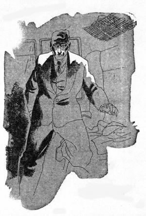 Philip klom als een eekhoorn naar boven. Beverwijk volgde hem, stak zijn zaklantaarn aan en richtte den straal naar beneden. Op het dak lag het lichaam van een man. Zijn hoofd was op afgrijselijke wijze verpletterd. Het was duidelijk, dat hier geen hulp meer kon baten. Hij lag voorover, met zijn gezicht op het dak van den wagen.