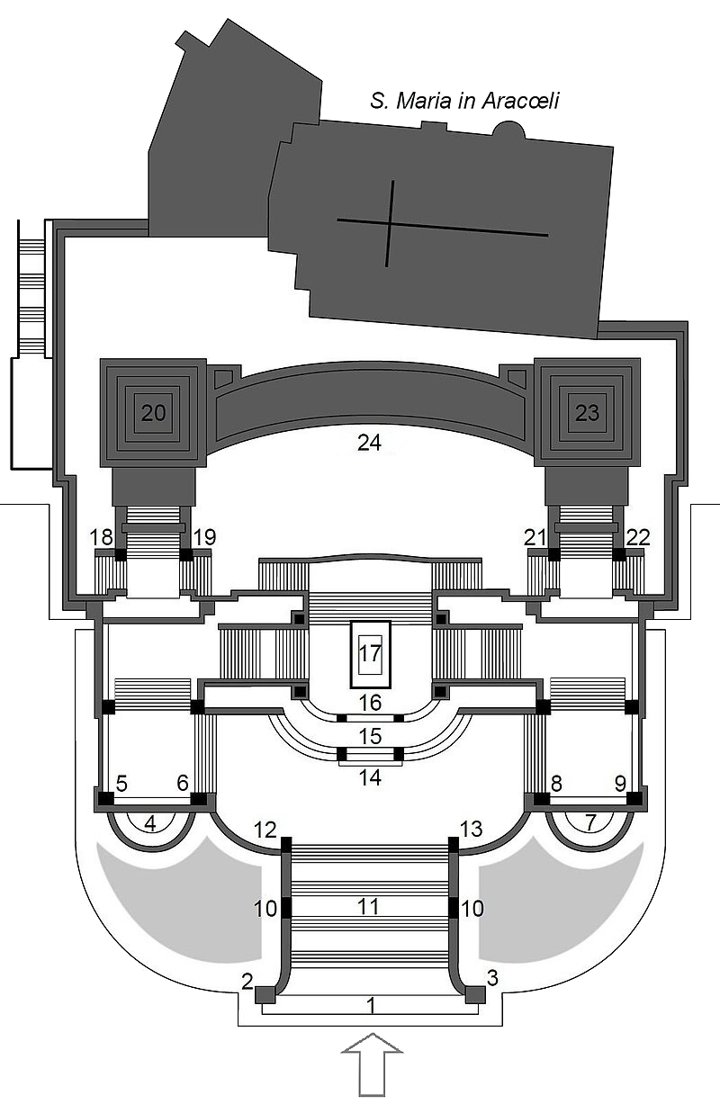 eigenlijke Altaar van het Vaderland, een werk van Angelo Zanelli (voluit: Angelo Bortolo Zanelli, * 17 maart 1879 , 1942). Daar splitst de trap zich in
